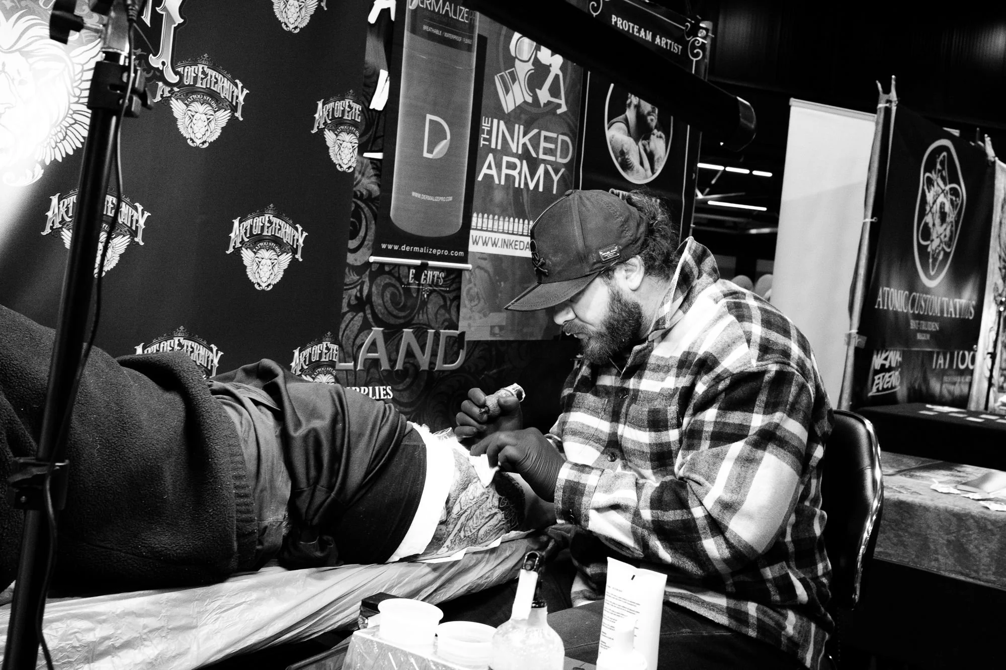 The next day, Sunday, we’d expected fewer people than the day before. Normally, Sundays are the less busy days for such conventions. But boy were we wrong! Pretty soon on, the arena filled up with people, and we had a blast. Richard had a couple of tattoos to do, including a nice idea for a sleeve on which he’d now done the first part.