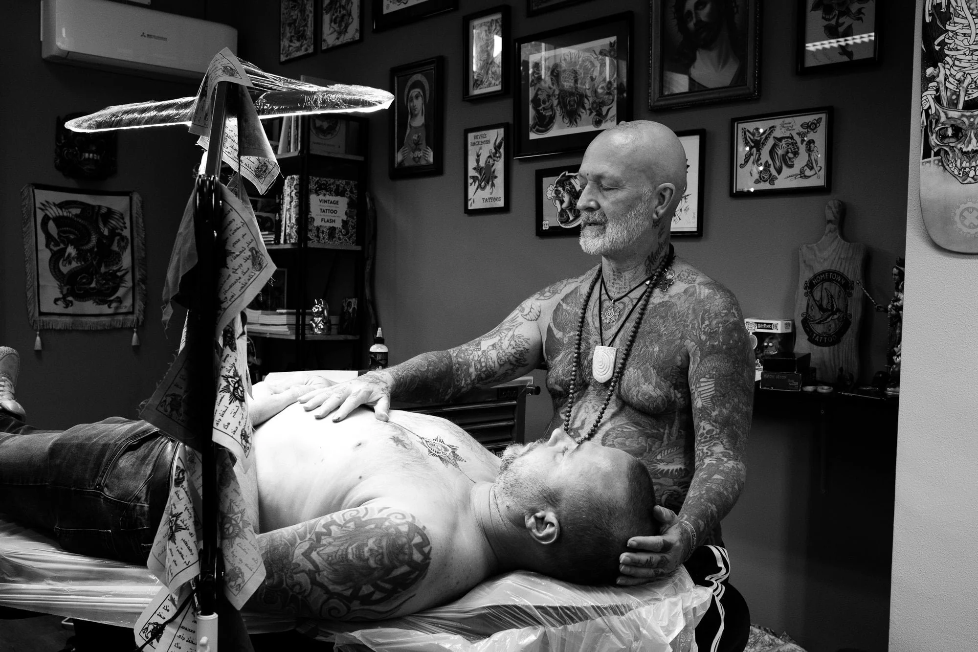 So when Ori posted that he’d be travelling in the Netherlands, doing hand-poke tattoos and spiritual sound circles, Richard reached out to Ori for a flash day at his shop, Hometown Tattoo. Ori loved the idea, so they quickly set a date, and as soon as I knew about it, I arranged a day off from work to help out a bit and take some photos to keep the day in our memories.